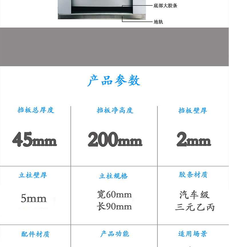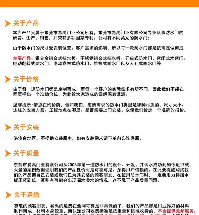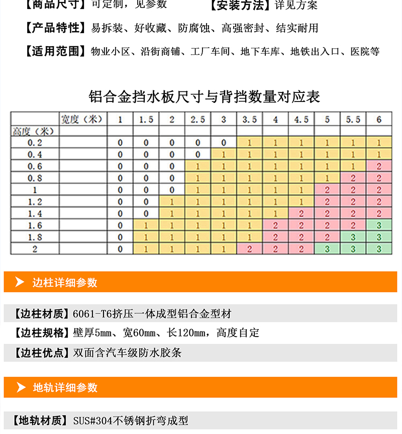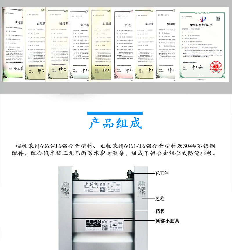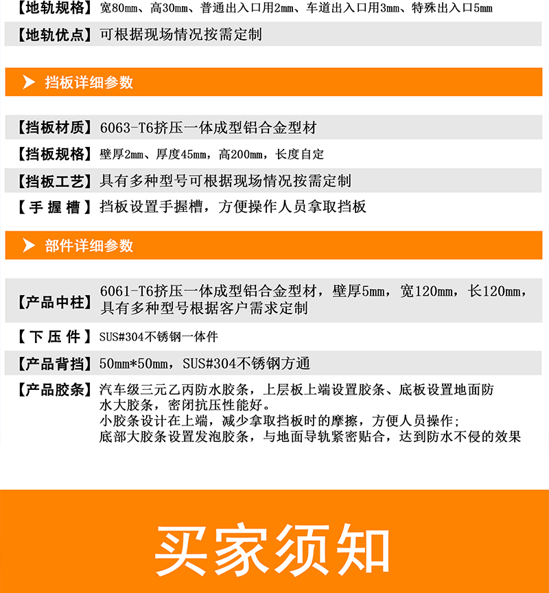 【一套铝合金组合式防水门标配必须包含】地轨、边柱、挡板、下压件、防水胶条、中柱、背挡、专用扳手及其零配件。 |