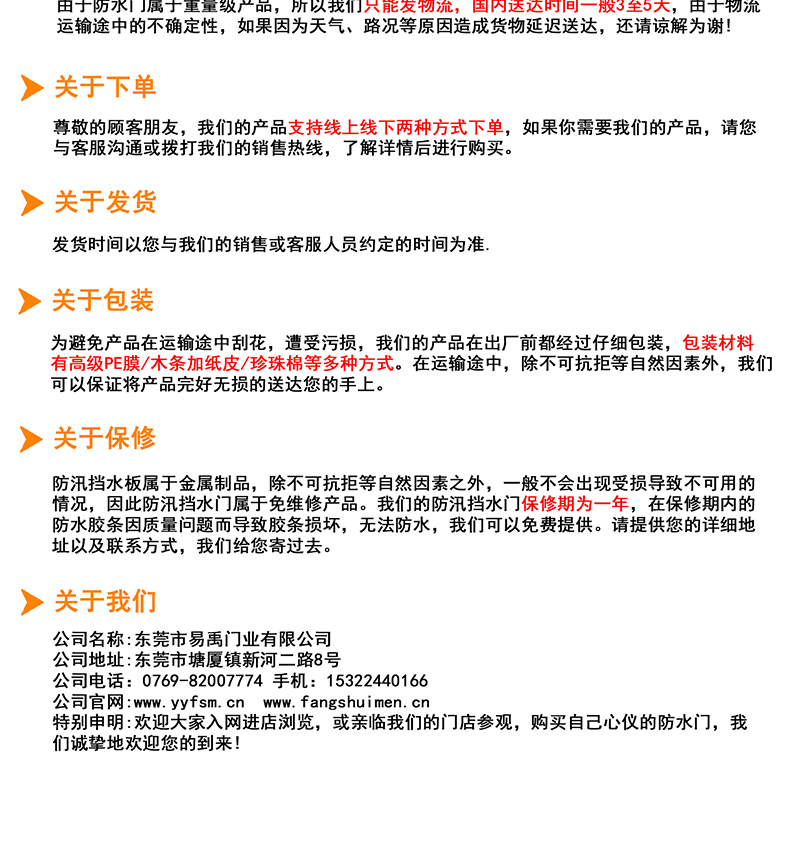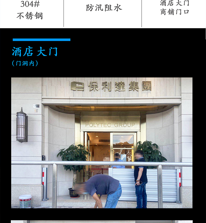 4.安装方法:插入式;5.主要用途:运用在商铺、工厂、车间、地下车库、地铁出入口等;6.使用工具:无需任何工具,可一人操作;7.安装时间:一般小门不超过5分钟,具体根据防水门大小而定。 |